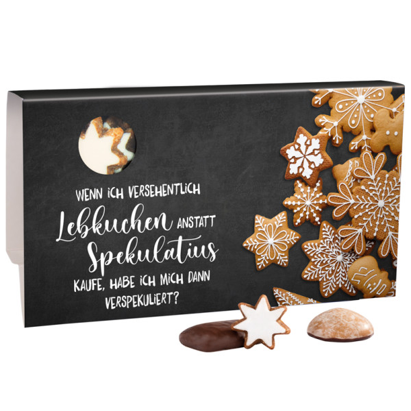 Haeberlein-Metzger Lebkuchenmischung im Werbeschuber aus weißem Karton, individuell bedruckt. Inhalt: Lebkuchenmischung von Haeberlein-Metzger mit 8 verschiedenen Sorten, 150 g
