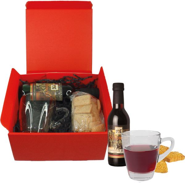Nichts geht in der Advents- und Weihnachtszeit über ein gutes Glas heißen Glühwein. Dieser lässt sich mit unserem Set ganz einfach zuhause zubereiten. Einfach den Glühwein erhitzen und im beigelegten Teeglas zusammen mit den Butterspekulatius genießen. Das Set enthält: Glühwein 0,25 l, Teeglas und 100 g Butterspekulatius. Platz für den Werbedruck auf dem Anhängekärtchen Artikel 6202(40 x 60 mm) ab 100 Stück oder Ihre Beilage nach Wunsch Inhalt: 0,25 l Glühwein, Glastasse, ca. 100 g Butterspekulatius Warn- und Sicherheitshinweise: Nicht für Kinder geeignet